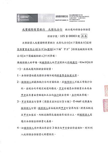 彰化市有一家負責任的淨水器廠商多年前就已經買了濾水器及濾心的銀行履約保證, 透過兆豐銀行對這家廠商的信任與保證,如果你的濾心器找不到一樣的濾心更換,兆豐銀行將履約保證賠償你的損失,這才是負責任的品牌廠。